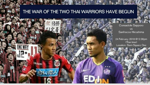 อย่าง "มุ้ย" ธีรศิลป์ แดงดา ที่ค้าแข้งอยู่กับ ซานเฟรชเช่ ฮิโรชิม่า และ ชนาธิป สงกระสินธ์ ที่พร้อมลงสนามในฐานะผู้เล่นของ คอนซาโดเล่ ซัปโปโร โดยความมันตลอด 90 นาทีเต็ม จะปรากฏสู่สายตาแฟนลูกหนังไทยบนจอใหญ่ยักษ์ ณ ลานอัฒจันทร์ ศูนย์การค้าสยามสแควร์วัน ในวันที่ 24 ก.พ. 2561 ตั้งแต่เวลา 12:00 น. ตามเวลาประเทศไทยเป็นต้นไป กิจกรรมจะเริ่มตั้งแต่เวลา 11:00 น.
